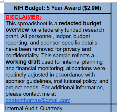 I have experience supporting accounting operations utilizing a broad range of competencies for adhering to strict auditing/reporting standards, data administration, and technical skills for operating finance management software. Below, you'll find a sample overview for a budget that I assisted with coordinating.